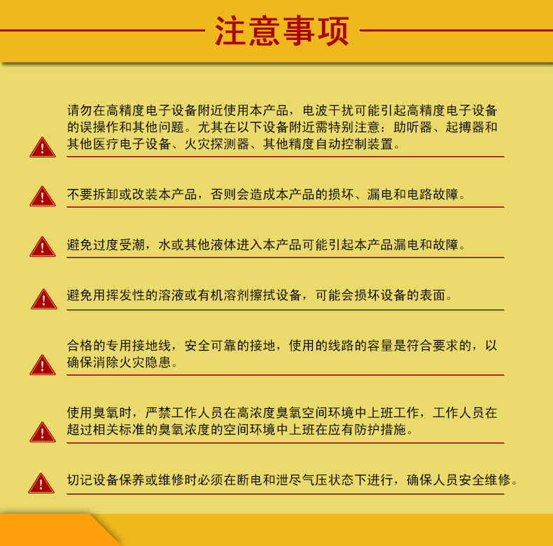 4:禁止將臭氧機放在消毒區內工作,為了工作的安全,設備應有單獨工作區,再用硅膠管將臭氧氣體輸送到消毒或化學反應區。